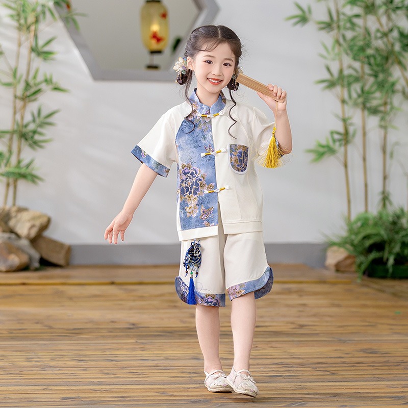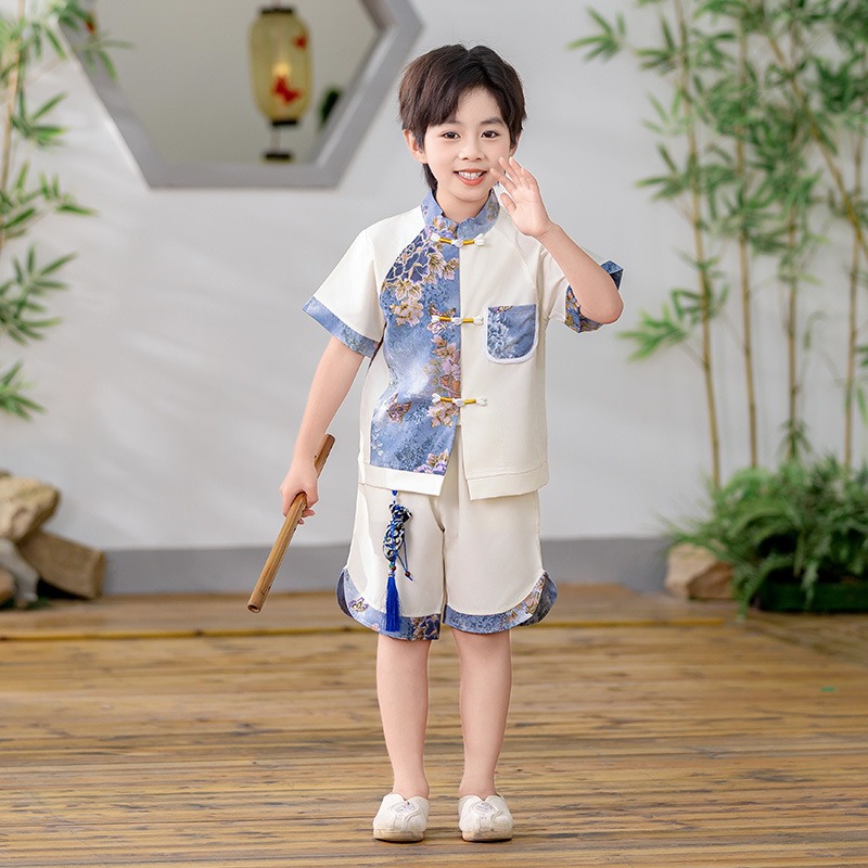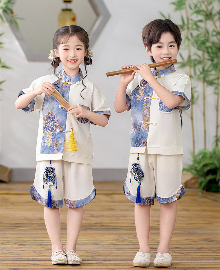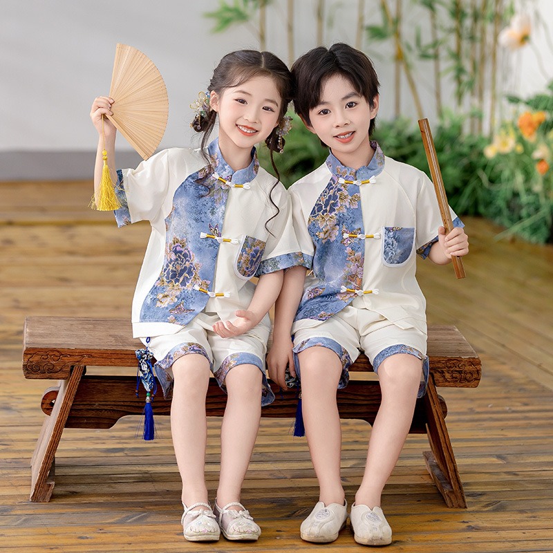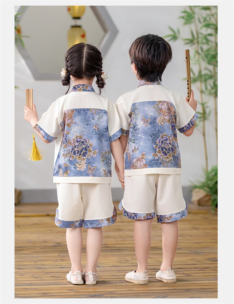 Boys Chinese Tang Student Clothing Print Blue Flower Top for Girls Support Customize Embroidery Logo Name