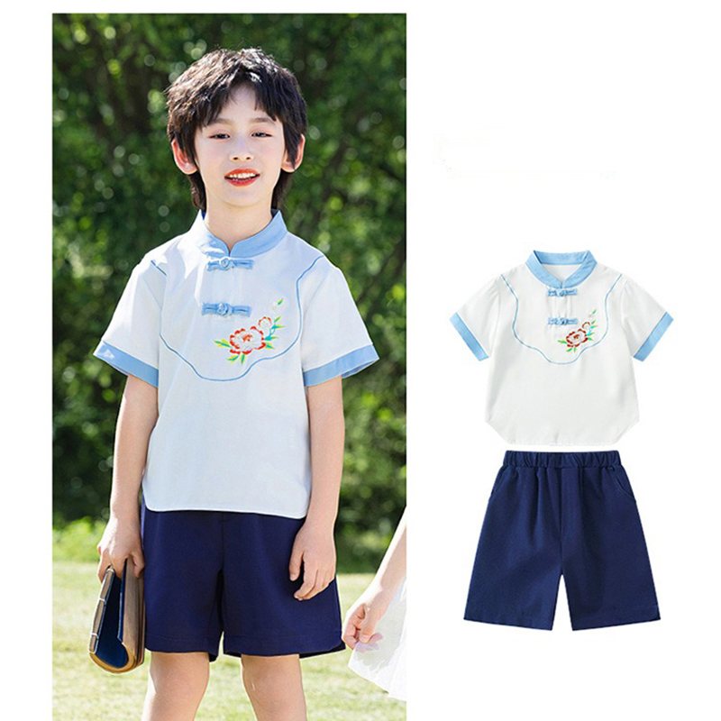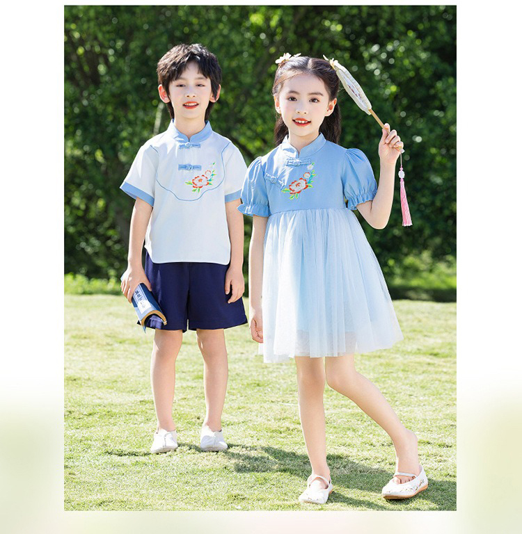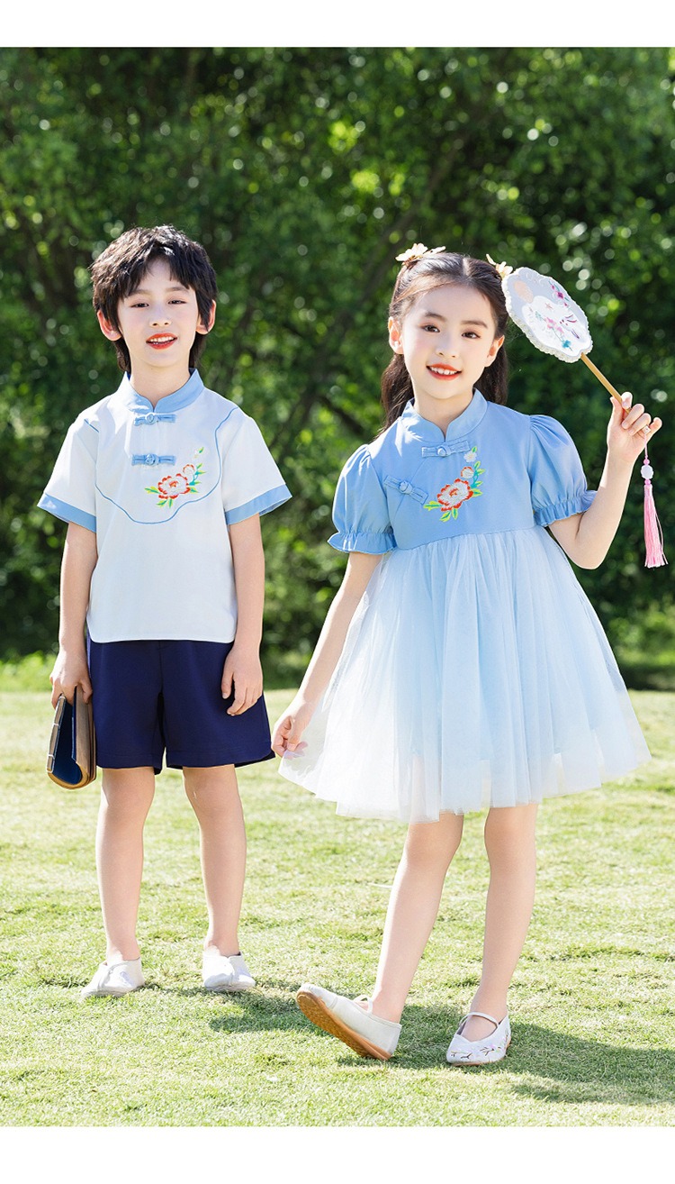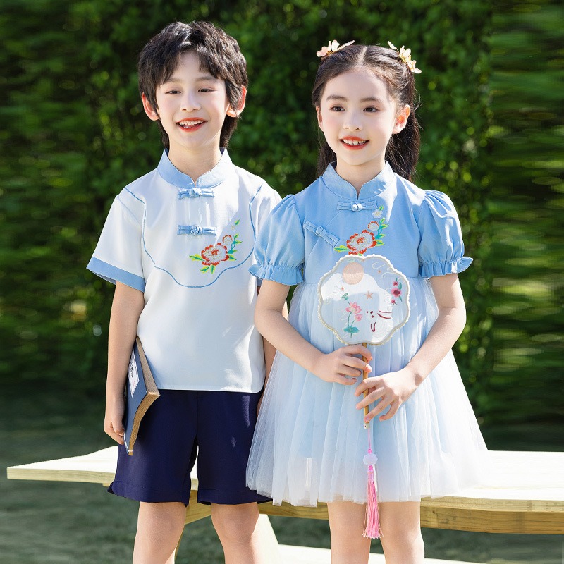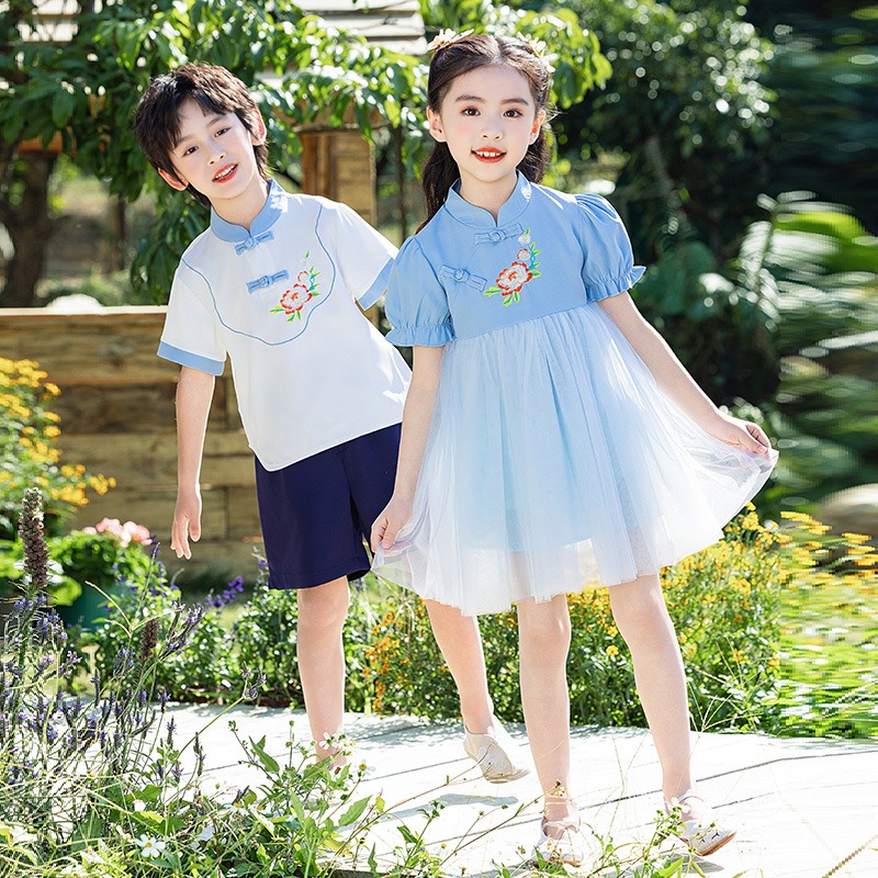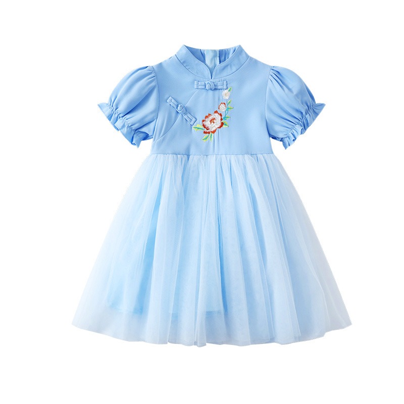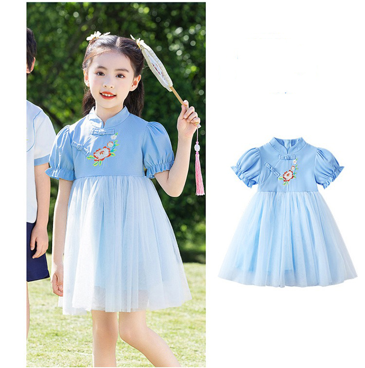 Chinese Style Baby Girl’s Dress Short Sleeve Vintage Hanfu Dress Blue Princess Dress Kids Modern Hanfu for Customize Name
