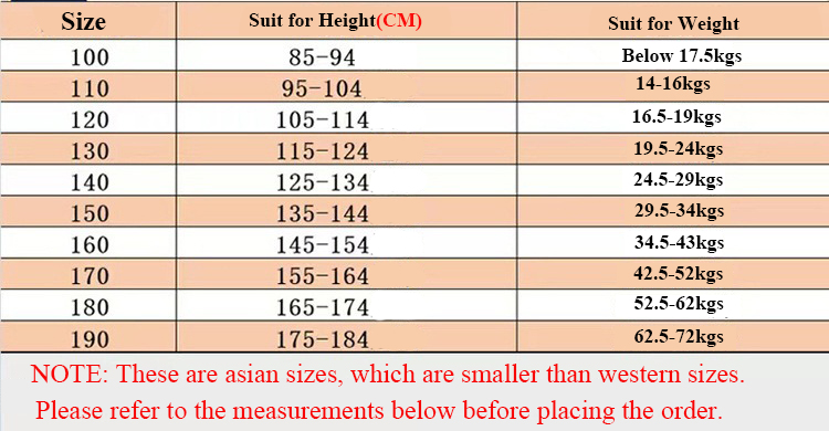 | Kid Size | 100, 110, 120, 130, 140, 150, 160, 170, 180 |